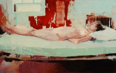 Di continue fluttuazioni di colore rosso sono pervase le opere di Kanevsky, che scorrono permeando il candore di giacenti corpi femminili.