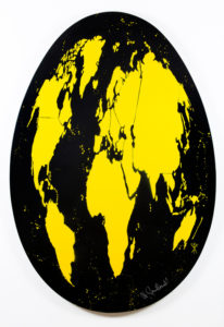 e i Continenti i lavori di Mr. Savethewall. Con la serie La fine del mondo, opere realizzate a stencil e dripping, l’artista tratta il delicato tema legato alla morte e alla rinascita, alla distruzione e alla creazione. Ispirati dalle opere di Lucio Fontana “La fine di Dio”, i lavori hanno come elemento simbolico, l’uovo, con il quale Mr. Savethewall allude al mondo. Un mondo concepito come una forma imperfetta, non circolare ma allungata: metafora di un’imminente esplosione, di una situazione straziante, di una fine. Ma non è solo questa la visione dell’artista. Nel suo significato iconografico tradizionale, infatti l’uovo è simbolo di una nuova vita e di positività: presagio di un nuovo inizio.