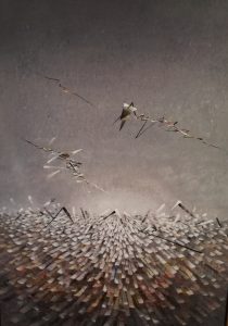 ” Sono sedotto da tutto ciò che vola, – dice – soprattutto dal vento, che amo dipingere. In particolare mi attraggono le foglie che si staccano dai rami e che, come in una danza, si lasciano trasportare fino a toccare terra. Soffi di magia che creano movimento nelle affascinanti evoluzioni che disegnano tra spirali e vortici. Nella leggerezza, le foglie si lasciano cullare e tutt’intorno diventa musica e silenzio. Trovo molta poesia in questi momenti, sensazioni che cerco di trasmettere nei miei dipinti. Bisognerebbe apprezzare di più il silenzio e la solitudine, cercando di captarne tutta la bellezza e l’armonia , per conoscere e scoprire il proprio carattere, se stessi e i pensieri più profondi”…