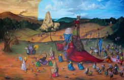 Quell'articolata e sconnessa umanità, con al centro una figura dominante, quale spirito guida, si muove in scenari nei quali in lontananza, in contrasto con l'armoniosa modulazione delle colline e la delicatezza dei colori della natura circostante, appaiono più simboli di sacrificio, sui quali simbolicamente incombono nubi pregne di pioggia.