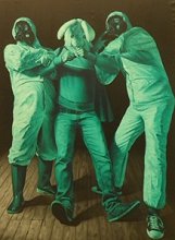 I personaggi ritratti dal giovane artista ci appaiono come in un acquario, separati da noi da un filtro monocromatico verde acido, a rappresentare un mondo futuribile, conseguenza diretta di esperimenti di ingegneria genetica.