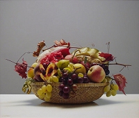 Un'altra opera dell'artistaArte mimetica – L'esposizione presenta 30 dipinti, rappresentanti corpi nudi, frutti e foglie adagiati in ceste, tazze orientaleggianti e morbidi drappeggi, contro sfondi neri o grigi, realizzati con una maestria pittorica della più antica tradizione realistica derivata dai pittori seicenteschi. La lunga storia della natura morta, interpretata nei secoli da tanti artisti soprattutto di area fiamminga, sembra rivivere anche oggi grazie a questo "Caravaggio del ventesimo secolo" , come è stato definito da Federico Zeri per il suo "iperrealismo" e la sua tenacità nel perseguire fino all'estremo l'imperativo della "mimesis". Un abilità illusionistica la sua che lascia sbalorditi proprio perché, nell'epoca della più sofistica tecnologia multimediale, è invece ottenuta con i più tradizionali mezzi pittorici, avvalendosi di tecniche artistiche raffinate come il colore ad olio steso per infinite velature.