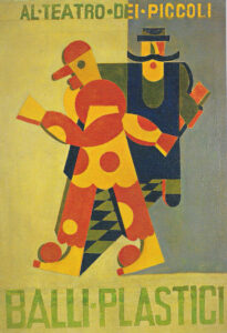 Su musiche di Malipiero, Bártok, Casella e del suo allievo Gerald Tyrwhitt e con le coreografie di Clavel “danzavano” le marionette di Depero, fantocci a grandezza d’uomo di legno colorato dalle forme essenziali e fantastiche e dalle tinte sgargianti e piatte che sovvertivano del tutto l’idea del balletto, aprendo con la loro meccanizzata rigidezza ad un mondo antinaturalistico popolato solo di automi stilizzati: “la selvaggia gigantesca, topi bianchi e gatto nero, uomini baffuti” che si muovevano e gesticolavano in un universo fantastico tra “danze ubriache” e “pioggia di sigarette”. (nella foto, Cartellone per i “Balli Plastci” al Teatrodei Piccoli)