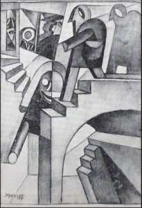 Occorre andare al 1917, anno di guerra, ma sull’isola di Capri non poi tanto. Depero vi arrivò con la moglie Rosetta su invito appunto di Clavel che stava a villa Saida in attesa della conclusione dei lavori alla torre del Fornillo a Positano destinata a diventare la sua casa. Lo aveva conosciuto a Roma quando era intento allo scenario e ai costumi per Le chant du Rossignol di Stravinkij, impresa non andata a buon fine, ma comunque vantaggiosa perché gli permise di conoscere l’ambiente di avanguardia internazionale ruotante intorno ai Ballets