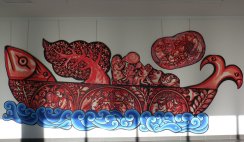 Lunga oltre tre metri, l'arca dell'artista giapponese eseguita in legno con spessore di pochi centimetri, sospesa alla parete, pare in sosta il tempo necessario affinché oggetti e personaggi possano recare sollievo a chi in quel luogo transita o permane.