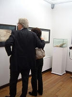 Il critico e Carla Tavernari abbracciatiAttratto dalla materia – A presentare la mostra al critico milanese è la figlia dello scultore, Carla Tavernari, che guida l'assessore tra le opere raccontandone storie e aneddoti. Si soffermano sulle due sculture lignee, una delle quali è di proprietà del critico. Sgarbi ne sottolinea immediatamente la somiglianza stilistica. Il critico tocca e muove tutte le opere attratto dalla materia, quasi a ricercare il gesto originale dell'artista. I complimenti non mancano anche all'allestimento e in particolare alla gigantografia fotografica di una delle opere grafiche di Tavernari eseguita dallo stesso Zanzi, presente in galleria. La visita è piuttosto veloce, scorrendo tra i pezzi esposti e arrivando allo splendido balcone che dà sulla piazzetta Albuzzi.