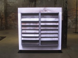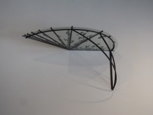 E’ il misurato respiro di una presa d’aria a definire la cadenza dell’intero impianto espositivo dove le sculture composte da differenti parti metalliche e frammenti di vetro, con la loro immobilità conferiscono compiutezza al lavoro dell’artista irlandese.