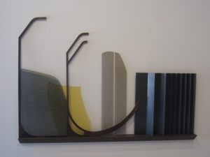 E procedendo nel percorso espositivo, l’idea di sosta appare insita nelle due sagome appese ad una parete da un unico sostegno in un silenzio statico teso mettere in risalto le distinte formali essenzialità.