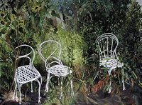 A. Grimoldi, Giardino, 2006In memoria di Guttuso – Altre motivazioni stanno alla base della scelta delle due sorelle, Angela e Giovanna Grimoldi, peraltro entrambe portatrici sane di un brillante curriculum internazionale nel campo del fashion design, anche se Angela passa ancora alla storia come la modella velatese del maestro Renato Guttuso da cui ha poi per via mutuato la sua passione collaterale per la pittura che tuttora dura. E Guttuso, il suo ricordo nel ventennale della scomparsa, è certamente uno degli appigli di questa esposizione che intende ricordare il siciliano trapiantato al Nord per interposta persona e interposti rapporti cromatici che Angela ha desunto e continua a conservare da quegli di apprendistato pittorico nella villa di Mimise Dotti.