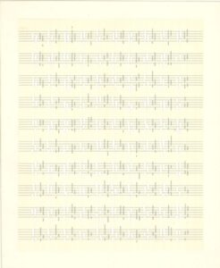 All’interno del rigore orizzontale di un pentagramma, Betty Danon crea ideali sonorità con minime presenze rettangolari che nel loro succedersi assumono soavi cadenze sonore.