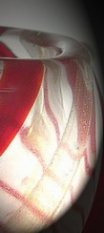 Negli oggetti finiti, luci, riflessi e colori si intrecciano tra loro creando un perpetuo dinamismo, tra concavità e lucentezze, che ci rimanda ancora alla magia di quell'attimo d'ancestrale creazione. Concavità ricche di mistero quelle di Gio Tenti, in cui la luce che si infrange nella trasparenza guida chi ammira in un percorso fantastico e tutto da scoprire. Linee dinamiche rosso rubino venano fluidamente la pasta bianca mentre riflessi dorati impreziosiscono queste creazioni uniche, vive e vitali.