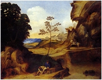É un'emozione davvero profonda vedere a Castelfranco, nelle anguste stanze della casa dove forse Zorzi non é nato, ma sicuramente ha frequentato dato che vi ha dipinto un enigmatico fregio, tutto un riferimento sottile e complesso alla cultura umanistica ed alle curiosità astrologiche predilette dagli intellettuali di allora, é un'emozione profonda, si diceva, vedere queste tavole, a partire dall'intrigante Tramonto della National Gallery di Londra, purtroppo compromesso da alcuni azzardati "restauri". Si tratta certo di un'opera complessa nel suo significato che ora, prendendo spunto dalle due figure di uomini assisi sulla roccia, distanti da un borgo di case possenti, si vuol ricollegare al mitico eroe greco Filottete morso da un serpente e abbandonato sull'isola di Lemno secondo il racconto di Sofocle nell'omonima tragedia fatta conoscere a Venezia proprio in quegli anni grazie alla stampa che ne fece Aldo Manuzio. Enrico Maria Dal Pozzolo, curatore della rassegna insieme con Antonio Paolucci e Lionello Puppi, propone questa congettura identificativa nel poderoso catalogo (526 pagine ben composte dall'editore Skira) ma, al di là del soggetto, su cui certo verranno avanzate altre interpretazioni come accadde ed accade per la notissima Tempesta, dipinta per il "magnifico" Gabriele Vendramin ed esposta a Castelfranco, lascia stupefatti il modo di presentare la natura nei suoi molteplici, vitali fenomeni e nelle sue profonde relazioni con l'uomo che di essa fa parte, in armonia, senza dominarla.