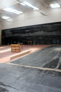 L’allestimento progettato da Francesco Librizzi nasce dal desiderio di preservare l’esperienza originaria della mostra, ma anche di rinnovarla attraverso un dialogo diretto con la Sala Stirling, uno spazio dal forte carattere architettonico, segnato dal cemento a vista e dalla monumentalità del pilastro centrale. Per inserirvi l’opera, è stata costruita una struttura che la introduce come una grande quinta teatrale, un dispositivo scenico che amplifica il senso di profondità e sospensione.