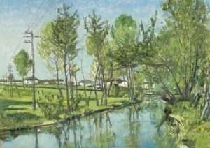 Inevitabile appare dunque il confronto con Sorgenti del lago di Ganna del 1913 di Lodovico Cavaleri che raffigura uno scorcio naturalistico dei dintorni di Varese. Studente di medicina, Cavaleri iniziò a dipingere come autodidatta, dedicandosi esclusivamente al tema della veduta. Il paesaggio della Valganna, dove il pittore soggiornò a lungo, è tradotto in un linguaggio brillante e materico:qui ha saputo cogliere una giornata nuvolosa, forse un inizio di primavera, illustrando un paesaggio tutto giocato sui toni freddi del grigio e del verde. Una “bella pittura” che gli garantì un discreto successo commerciale e numerose commissioni pubbliche, oltre agli acquisti ufficiali del re. Nel 1893 l’artista vinse anche la medaglia d’oro alla Mostra Nazionale della Società di Belle Arti a Milano. Interessante ricordare che Cavaleri fu anche un importante pubblicitario: a lui si devono infatti i notissimi manifesti per la Birra Poretti del 1900 e nel 1918.