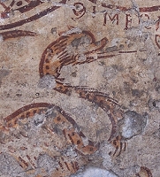 La chimeraLa 'prima donna' – Di sicura importanza sono i ritrovamenti pittorici scoperti nel sottosuolo della chiesa, in particolare un affresco – ben conservato – apparso alla base del campanile e risalente al 1000 – 1100 in cui è rappresentata la "Chimera", un animale mitologico con tre teste (leone, serpente e capra) la cui raffigurazione in uno spazio sacro è rarissima, se non addirittura unica e rende il dipinto scoperto a San Biagio molto importante per la storia della Valcuvia e dell'iconografia sacra.