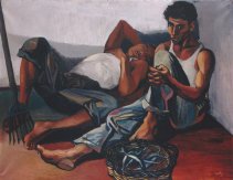 R. Guttuso, Pescatori in riposocopertura cronologica e stilistica. E se La spiaggia, Il Comizio, Caffè Greco (eccezionalmente prestato dal Museo Thyssen-Bornemisza di Madrid), Spes contra spem sono le vere e proprie icone, certamente alta è la qualità anche delle altre opere proposte: a cominciare dalle drammatiche nature morte che, negli anni Quaranta, facevano presagire la tragedia della guerra e della catastrofe, fra realismo organolettico e narrativo postcubista. O i personaggi del "realismo sociale" e poi di quello "esistenziale" degli anni Cinquanta, fino alle situazioni del suo particolare "realismo memoriale". Oltre che dal museo madrileno, le opere provengono da importanti musei italiani e da celebri collezioni, come la Collezione Barilla d'Arte Moderna e la Fondazione Francesco Pellin, originata, quest'ultima, dal rapporto di amicizia fra il pittore e l'industriale varesino, di recente scomparso, testimoniata da una raccolta di opere guttusiane di grande bellezza e dal sostegno alla pubblicazione del Catalogo Generale del pittore, curato da Enrico Crispolti, autore anche del saggio principale del catalogo della mostra.