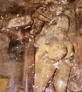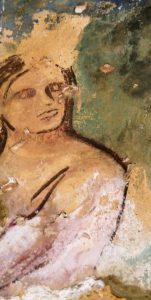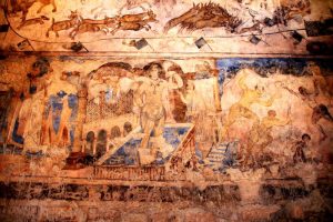 Le pareti interne ed il soffitto sono interamente ricoperte da splendidi affreschi: sembra di essere capitati in una specie di Cappella Sistina mediorientale, fino a qualche decennio fa coperta dalla sabbia. Uno scherzo effimero e bizzarro, nel silenzio definitivo del deserto, che riecheggia però di schizzi d’acqua, risate di ragazze, drappi fruscianti, elementi naturali, dipinti in modo sapientemente realistico e sensuale, cinque secoli prima del Rinascimento Europeo.
