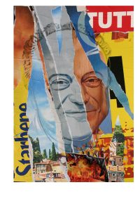 Completano la mostra alcuni disegni a tecnica mista, diverse incisioni, oltre a sette Accept-Paintings, collages realizzati nell’ultimo decennio dove convivono grafica, disegno, pittura e fotografia. Opere realizzate con materiali di recupero che si sovrappongono uno sull’altro per letture molteplici, dove le parole completano il piano compositivo e cromatico facendo emergere in maniera ironica e critica il pensiero dell’artista su alcuni dei personaggi più importanti del mondo culturale, politico e sociale: fra questi Don Tonino Bello, dichiarato venerabile da Papa Francesco nel novembre del 2021, Anna Politkovskaya la più famosa giornalista russa che ha pagato con la propria vita la ricerca delle verità, e Nicola Gratteri, magistrato calabrese che combatte a viso aperto mafie e ingiustizie.