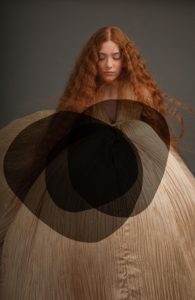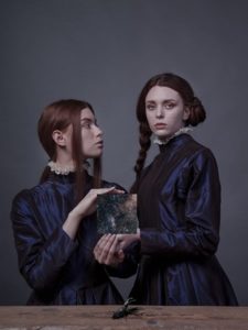 Due fanciulle in fiore paiono sottratte per l’occasione ad un romanzo di Emily Dickinson; sorreggono, con lieve postura, una forma quadrata la cui profondità prospettica conduce all’immensità di un cielo stellato. In altro contesto una etera giovane donna, avvolta nel candore di un abito orlato di pizzi e cadenzato da preziosi ricami, pare perdersi in intime meditazioni aprendo il proprio mondo interiore ad una scoscesa cadenza rocciosa.