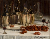 Gamberi e fiaschi (1886)I 150 anni di Emilio Longoni – Nel 1876 frequenta la Regia Accademia di Brera con i compagni Gaetano Previati, Cesare Tallone, Ernesto Bazzaro, Medardo Rosso, Mario Quadrelli, Giovanni Sottocornola e Segantini, con cui divide il domicilio. Sono anni importanti per Emilio Longoni, quartogenito di una numerosa famiglia, costretto a trasferitosi da Barlassina a Milano in cerca di lavoro. Un giovane dal carattere solitario e schivo, sia in famiglia che a scuola, riesce ad emergere e sollevarsi solo durante le prime esperienze artistiche milanesi, quando ha la possibilità di dedicarsi alla sua vera e unica passione sentita fin dalla fanciullezza: la pittura. Dalle aule dell'Accademia alle commissioni dell'ebanista Carlo Bugatti per il quale Longoni dipinge ante di mobili con nature morte ed esegue pannelli decorativi dipinti. Il giovane frequenta inoltre la Famiglia Artistica milanese, diventandone uno dei membri più assidui e fattivi.