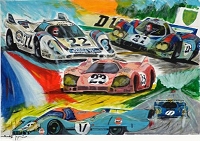G. Benedetti, Le MansEvoluzione – Ha cominciato da giovane, a scarabocchiare, prima, disegnare poi, dipingere alla fine tutto quello che gravitava fuori ma sopratutto dentro le piste automobolistiche. Giorgio Bendetti, bustocco, ha iniziato così, coniugando le sue due passioni: quella per la pittura e quella per il circo dei bolidi, a partire dagli anni Settanta, quando l'amore per le corse lo portava a campeggiare ben dentro l'autodromo, a viverlo sulla pelle, senza il tramite dei mezzi di informazione.