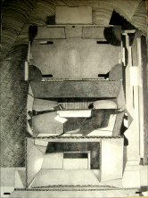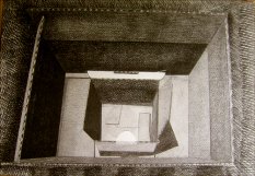 Il tratto grafico fitto ed insistito, infatti, sottolinea i contorni delle strutture, i profili dei parallelepipedi in un sorprendente gioco di scatole cinesi. L'intreccio dei segni a matita e la ricchezza delle sfumature a grafite modulano il chiaroscuro, delimitando le zone bagnate dalla luce e quelle lasciate in ombra.