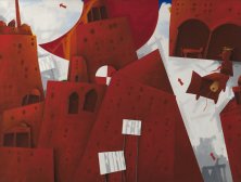 Una delle opere in mostraSuggestionato da alcune particolari immagini, come la figura del filosofo, o dei profughi, o della città, Emilio Tadini le riporta sulla tela come se volesse raccontarle, con uno stile narrativo e lirico.
