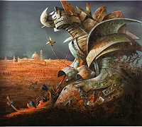 I guerrieri sono mostri – Sono impressionanti quei guerrieri di latta che dominano la tela con le loro armature fatte di tutto ciò che l'uomo abbandona, "rifiuta" di sé e lascia dimenticato, derelitto a sedimentare nel tempo. Agli occhi sensibili di un artista, la realtà si dilata e si espande verso il futuro immaginato ed è in grado di vederlo in anticipo rispetto ai più: Mario Logli ha dipinto il futuro nelle sue opere e lo possiamo, ora, verificare perché lo stiamo vivendo. Quei guerrieri si sono nutriti di ciò che l'uomo urbano ha lasciato al suo passaggio sulla terra dimenticandone il valore. I mostri-guerrieri non sono lì, per difenderla, la città, ma sono i mostri che la città ha prodotto, quando l'uomo l'ha resa invivibile, quando le regole della civiltà sono calpestate da valori effimeri, quando il rispetto verso l'altro è ucciso da sentimenti egoistici, e violenti.