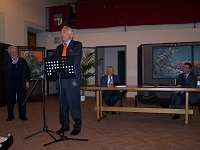 Un momento della presentazioneLe città in fuga – Poi, pezzi di terra lacerata con sopra città riconoscibili si staccano dal terreno arido e si alzano verso il cielo, in cerca di una nuova possibilità di vita, nell'intento possibile nell'arte di salvarsi, di proteggere tutto ciò che di bello possiede l'uomo, quando rispetta se stesso e la natura. Una speranza, un estremo appello lirico, a chi guarda, per renderlo consapevole, che forse, quella sarà l'unica possibilità di salvezza, se l'uomo non combatterà e vincerà la ‘guerra' con quei mostri di latta che sono dentro di sé, frutto del suo insano spirito di autodistruzione. Un mondo che oggi vediamo intero, che si spezzerà in mille isole, le quali dovranno fuggire per salvarsi…chissà, forse, ora, siamo ancora in tempo per salvare le nostre città, che forse non avranno nemmeno la forza di staccarsi, se l'uomo contemporaneo non si responsabilizza della dimensione collettiva, in cui vive.