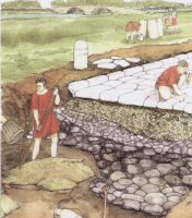 Come si costruivano le strade? Proprio perché destinate a durare a lungo, grande importanza era attribuita alla loro costruzione, preceduta da un sopralluogo dell'architetto, che stabiliva il percorso della strada, e dall'opera degli agrimensori, che individuavano i punti precisi. Si scavava una grande trincea, sul cui fondo si poneva un primo strato di pietre di grandi dimensioni; seguiva poi un secondo strato formato da pietre più piccole e cocci ed infine un livello di pietrisco misto a sabbia. Completava il tutto un lastricato di pietre squadrate o un piano di ciottoli. A fianco della strada, correva un marciapiede, spesso in battuto. Un po' come oggi, esisteva un sistema per indicare le distanze da, ovvero i miliari, pietre incise, che gli scavi archeologici molto spesso hanno portato alla luce. E la parola moderna "miglio" deriva proprio dal latino milia passum, ovvero mille passi.