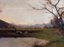 Dalla pittura di genere al paesaggio "dal vero". Lorenzo Delleani, nato a Pollone in provincia di Biella nel 1840, esordì nel campo della pittura storica e di genere, che continuò a frequentare anche nel periodo della maturità come testimoniato dai dipinti Lungarno del 1880 e In gondola a Venezia del 1892, ma già dalla metà degli anni Settanta spostò il suo interesse verso la rappresentazione del paesaggio studiato dal vero, inaugurando una nuova modalità di rapportarsi con la natura, che viene restituita nelle sue opere sia sotto l'aspetto "scientifico" di indagine delle condizioni atmosferiche e di variazione della luce sia sotto l'aspetto di partecipazione emozionale e soggettiva. Le località più amate e frequentate dall'artista, dalla sua cittadina natale al Monte Mucrone, da Fubine a Morozzo a Pinerolo, sono ritratte in numerose opere di piccole dimensioni in cui, come su un diario di viaggio o su un quaderno di reportage, Delleani annotava giorno, mese e anno di esecuzione. L'interesse dell'artista si sofferma spesso non solo sulla componente paesaggistica "pura", ma anche sulla dimensione umana della natura,