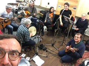 “Siamo in otto e possiamo contare davvero su un buon numero di strumenti: Adalberto Zappalà con mandolino, basso e chitarra, Daniele Rigamonti con il bodhran, percussioni e cajon, Gaia Ghidini al violino, Giuseppe Agape alla chitarra e basso, Matteo Giuliboni alla mandola e bouzouki, Roberto Rainaldi alla cornamusa e poi ci sono io che mi occupo dello spoon e del bodhran. Io, Adalberto ed Erica Magarelli costituiamo il corpo vocale del gruppo. Siamo le voci insomma!”.