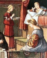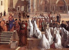 Nascita della Vergine (partic.)negli anni sessanta del Cinquecento, uno si trova a Brera ed è Il ritrovamento del corpo del Santo. Successivamente, fu portata anche la Predica di San Marco in Alessandria un capolavoro di grandi dimensioni, parliamo di circa otto metri, figlio della mano di Gentile Bellini e del fratello Giovanni.