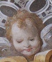 Interessanti sono i volti paffuti degli angioletti collocati sopra a queste tre figure. Abilmente scorciati, sembrano uscire dalla parete e volgersi verso basso, guardando così lo spettatore; il soffitto, infine, ripropone dei paesaggi naturali e due putti nella fascia centrale, di non altrettanta suggestione.
