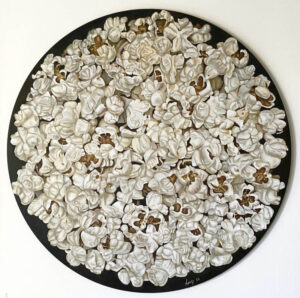Pop- Corn e Pop- Art: la scelta dell’ abbondanza, della ripetizione e del junk food sono icone della produzione di massa e testimoniano la vicinanza di questa giovane artista al pensiero provocatorio di Andy Wahorl e in particolare all’opera Campbell’s Soup.