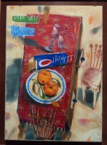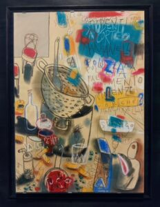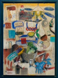 Vittoriano Ferioli utilizza cibo e utensili della cucina, dando loro un’anima e un temperamento, inserendoli in ambienti familiari. Gli oggetti sembrano danzare nello spazio, nature morte in assonometria, vibranti, con macchie di colore che lasciano presagire impronte di cibo sulla tovaglia.