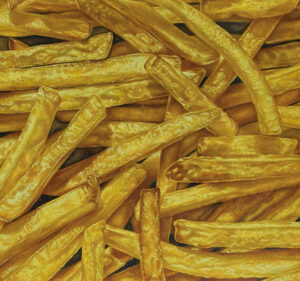 Per la Lenzi, l’arte del dettaglio viene rappresentata con un close-up alla Niklaus Stoecklin, ma è solo nella microscopica imperfezione che si cela la vera natura dell’uomo, un lato autentico, lontano dalla pubblicità. Così le patatine sono flaccide e irregolari, come nella realtà,