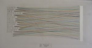 Alfabeti minuziosamente incolonnati animano appuntite frequenze multicolori, il cui moto pare compiere un razionale ricamo mosso da frenetiche tensioni spaziali.
