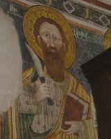 Fermiamoci un momento. Siamo di fronte a una teoria di personaggi affiancati, frontali, che un tempo sovrastavano un altare addossato a questa parete e dedicato a S. Stefano, più volte nominato nelle visite pastorali della fine del Cinquecento. I santi raffigurati sono Paolo, Antonio Abate, che compare due volte consecutivamente, Stefano e Bartolomeo. Siamo certamente di fronte alla stessa fantasia espressiva e rustica del maestro della Schiranetta, lo stesso tratto robusto e inciso, lo stesso disegno degli occhi e la stessa ricchezza dei panneggi.