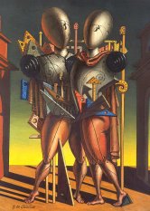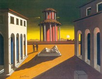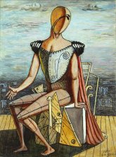 Testimonianze dirette sono offerte anche dalle 'Piazze d'Italia': se quelle degli anni Trenta risultano ancora deserte, silenziose e ansiogene, soprattutto alla vista delle due ombre che si allungano sulla sinistra e che annunciano l'arrivo di qualcuno, quelle degli anni Cinquanta, pur mostrando qualche presenza umana, due uomini che si salutano stringendosi la mano, non sembrano garantire all'osservatore un'esperienza differente. Lo stesso può valere anche per la figura del 'Trovatore', il manichino privo di arti superiori corredato da strumenti di misurazione geometrica, di 'Ettore e Andromaca', de 'Le muse Inquietanti': possono cambiare gli elementi dello sfondo e della composizione geometrica intorno al manichino, può cambiare anche l'impasto del colore, ma l'atmosfera non cambia.
