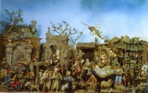 Rispetto alla tradizione bolognese che predilige il solo materiale della terracotta per la modellazione delle figure, in ambito napoletano si diffonde una produzione scultorea polimaterica che si identifica nella realizzazione di manichini con la testa di terracotta dipinta, le estremità preferibilmente in legno, l’anima di ferro dolce e il riempimento di stoffa, poi debitamente abbigliate con costumi e accessori dell’epoca. Questo tipo di rappresentazione corrisponde a una concreta espressione di arte barocca naturalistica, configurandosi come un plastico documento storico descrittivo dei costumi, delle usanze e delle tradizioni popolari, in un’epoca che vide Napoli splendida capitale di cultura e d’arte e meta irrinunciabile di colti viaggiatori italiani e stranieri.