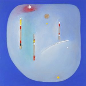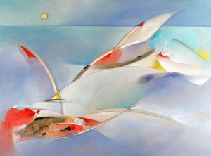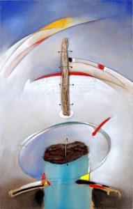 Energia vitale in cui figure sospese nello spazio interagiscono in una sorta di Danza Cosmica. L’artista crede in questa energia, nella tensione verso l’alto pur rimanendo legato alla realtà, guardando l’infinito, verso il mistero di ciò che non è ancora conosciuto; verso quella luce che si intravede oltre la montagna.