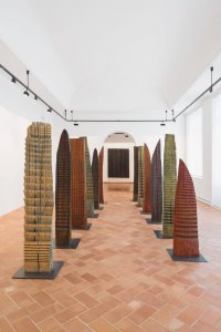 La mostra, che si sviluppa all’interno delle sale del Museo e nel cortile all’ingresso, raggruppa le opere secondo diversi temi: le Mappe, dove l’Artista immagina di recuperare una memoria topografica senza alcun riferimento reale, quasi cartografie dell’impossibile, incapaci di orientare, simbolo forse del nostro viaggio nella vita, compiuto senza una bussola; le Vicinie, piccole figure stilizzate e raggruppate, che recuperano antropologicamente una usanza dell’epoca delle invasioni barbariche, quando le persone per difendersi si consociavano, aiutandosi l’un l’altra; i Tondi, che hanno una forma circolare in quanto ispirati dal fondo delle botti in Francia Corta; le Edicole e le Madie, piccole case nelle quali si costudiscono oggetti poveri, realizzati artigianalmente, legati alla comunità e il Bosco, nel quale sono disposti 12 alberi, tronchi scartati dalla lavorazione della segheria e lavorati per ridar loro una dignità artistica. Questa sua attenzione alla verticalità le deriva sia dalle opere di Brancusi, che ammirava, che dal suo viaggio in Canada, dove restò affascinata dai grattacieli.