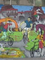 Mix espressivo – Veri protagonisti sono senza dubbio i ciclisti, ma non sempre ben delineati e rinonoscibili nei dettagli. A sinistra uno sportivo sfreccia a gran velocità, per passare al nucleo figurativo centrale dell'opera che vede diverse figure impegnate in salite faticose. Sagome, linee, colori innaturali. Sono un pò i trucchi e le caratteristiche di quest'arte, che si può permettere di unire figurativo e astratto senza perdere di vista il senso totale del lavoro pittorico. A destra tornano i ciclisti in gara, visti di fronte e affaticati dalla competitività della gara. E proprio durante l'inaugurazione ufficiale, ecco che passano i veri ciclisti, quelli che si stanno preparando per il secondo giorno di gare nelle strade varesine. Un attimo di contatto tra realtà e finzione. Un'occhiata veloce degli sportivi verso quel muro, che si spera rimarrà a decoro della via per molto tempo anche a mondiali conclusi.
