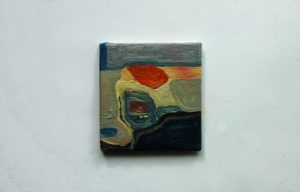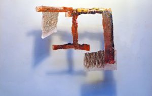 L’idea di intangibile fuga appare altresì in lavori di piccolo formato dove una serie di sovrapposizioni composte da strappi di stoffe e carte includono una percorrenza segnica tesa ad andare oltre le aree definite.