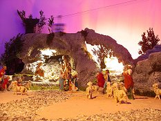 L'intero presepe, oltre ad essere animato da elementi in movimento e da giochi d'acqua, è inoltre arricchito da spettacolari effetti di luce, che ricreano l'alternarsi del giorno e della notte: dopo la luce piena di una giornata assolata, il telo che sta di sfondo si tinge dei colori del tramonto; e mentre il giorno volge al declino, le luci della città e della gotta si accendono; finché, sopravvenendo l'oscurità della notte, un intenso fascio di luce proveniente dal basso illumina la statua del Redentore, facendo rifulgere nello scurore notturno la sua bianca figura solenne e il suo ampio abbraccio che cinge il mondo.