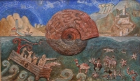 Viaggio nel tempo – Vittorio Pieroni, figlio d'arte, impara a disegnare da solo, a fianco del padre Mariano. Di professione artigiano del vetro, negli anni ha sviluppato una particolare interesse per la paleontologia, che lo ha portato a diventare figura di riferimento in ambito paleontologico per i Musei di Storia Naturale di Malnate e di Venegono. Di questo passato così distante e misterioso, quasi sconosciuto, ci vuole parlare nelle sue opere, ricorrendo ai simboli più significativi e riconoscibili, ma soprattutto più suggestivi, come la ricorrente immagine della conchiglia fossile, o più precisamente detta ammonite. Spesso collocata al centro del quadro, intorno ad essa si dispiega un mondo favoloso, dove persino il rispetto della proporzione o della prospettiva viene abbandonato. Ci immergiamo così in un mondo incantato, che torna alle radici della vita dell'uomo, nella sua purezza infantile, e della civiltà, con uno stile che ricorda gli affreschi medievali. Ce lo ricordano i paesini appena abbozzati sullo sfondo, arroccati su monti lontani, dai profili merlati, oltre che alla ricca iconografia medievale, fatta di creature mostruose, direttamente ispirate ai dettagli della cattedrali romaniche o gotiche. Il medioevo infatti costituisce l'altra grande passione di Vittorio, che nei suoi viaggi ama far tappa nelle chiese medievali per poter prender nota dal vero dei particolari decorativi più curiosi.