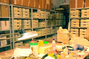 Al centro della stanza, sopra ad un grosso bancone, tra il disordine di barattoli, trapani da dentista e pennelli, incorniciato da una grande luce artificiale, c’è uno strano oggetto, evidentemente rinvenuto in una delle tombe qui intorno. Il restauratore non gli toglie gli occhi di dosso e anche quando siamo entrati nel laboratorio, ha cominciato a parlare senza nemmeno guardarci. E’ evidente che non è interessato a sapere chi siamo, da dove veniamo. Lui è lì per lavorare e visto che ci siamo anche noi, per raccontarci la SUA Storia.