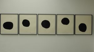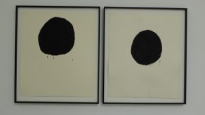 La calibrata imperfezione delle forme circolari definisce la misura del gesto e un misurato uso della materia. Nei 40 disegni, tutti pezzi unici realizzati da Serra per l’attuale mostra, si concentra l’assolutezza di rapporti tra estremi: il bianco della superficie piana e il nero della forma.