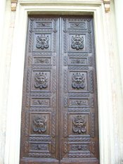 Tempio di Santa Croce, portaleportali sono in legno di noce e decorati con particolari mascheroni.